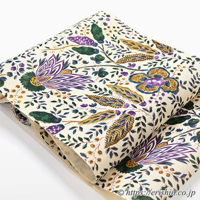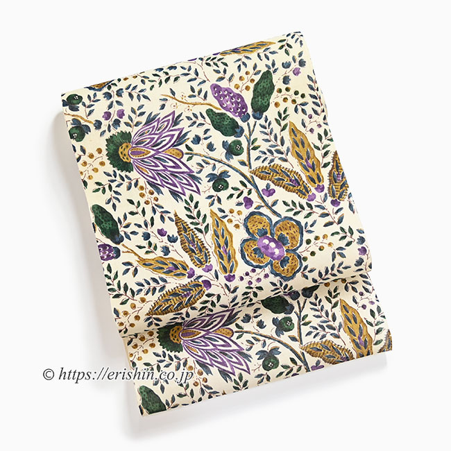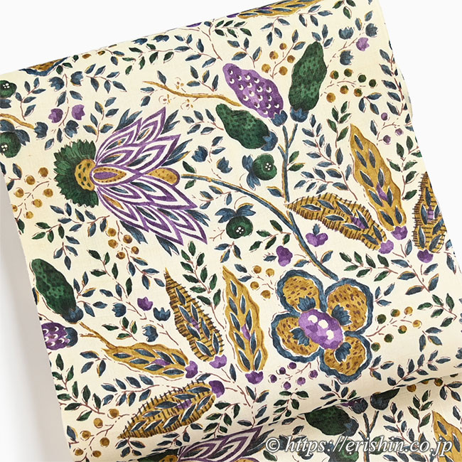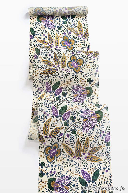 【お誂え】多ち花 染名古屋帯 (オランダ更紗/桑染色×深緑×紫・生紬)