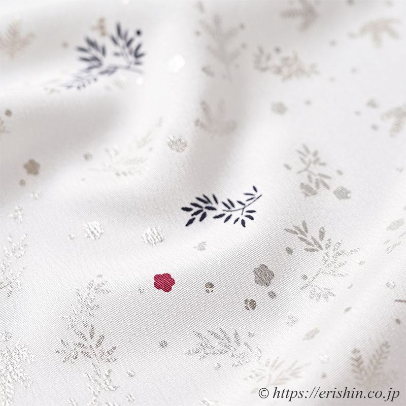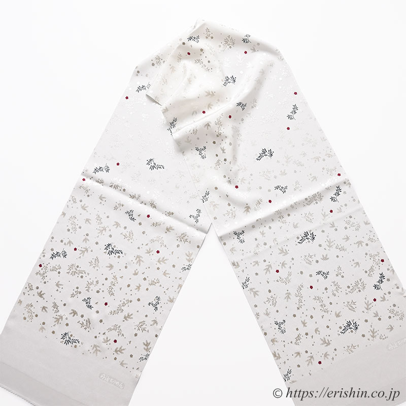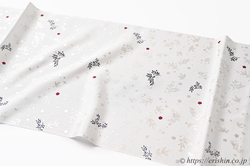 白の帯揚げ地に松竹梅の銀散らしが舞い、深蘇芳の赤い小梅が愛らしく、躍るような黒茶色の笹枝と、松竹梅をカジュアルな趣で染めた素敵な帯揚げです。