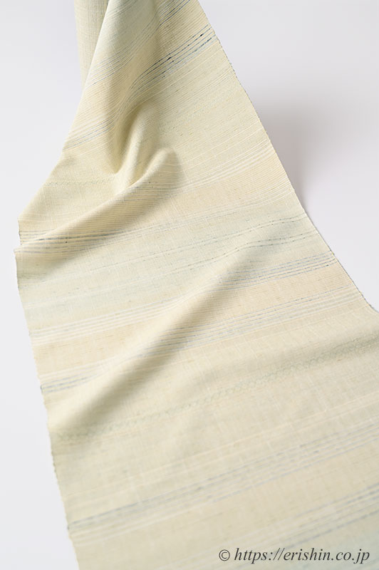 様々なベージュ系の緯の色合いが混じり合うゆらゆらとした柔らかさに、薄水色の緯が加わって多彩な朧霞のよう。