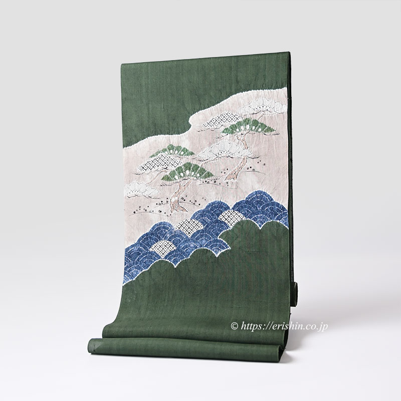 そこに風雅な松や連綿と続く波を辻ヶ花で描いた森健持さんの作品です。