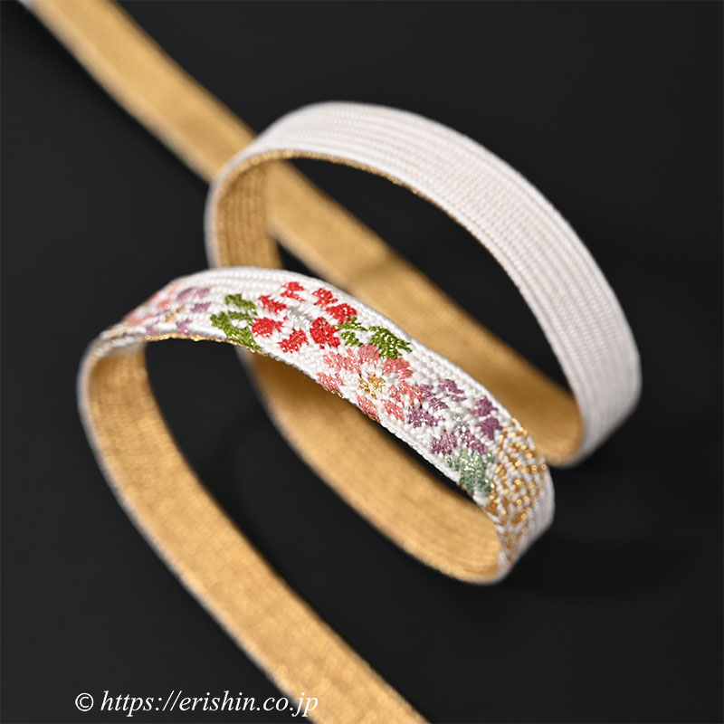 白と金の両面の礼装向けの高麗組は拝見する機会も多いのですが、この作品のように様々な色糸で花の刺繍を組み込んでいる作品はこちらだけ。