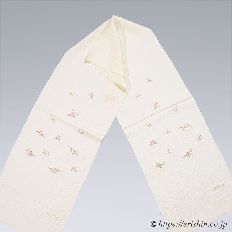 ふっくらとした縮緬地に、宝尽くしを刺繍した帯揚げです。