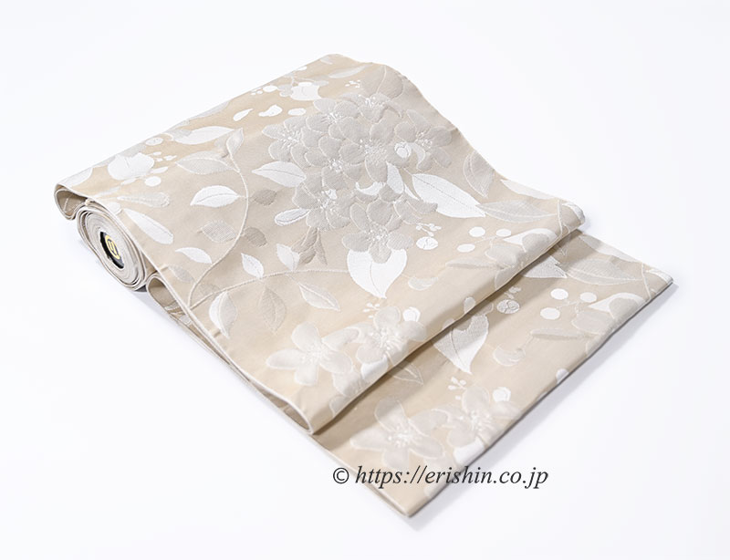 薄香色の帯地に濃淡でふんわりと織り上げられたシルクジャスミン。