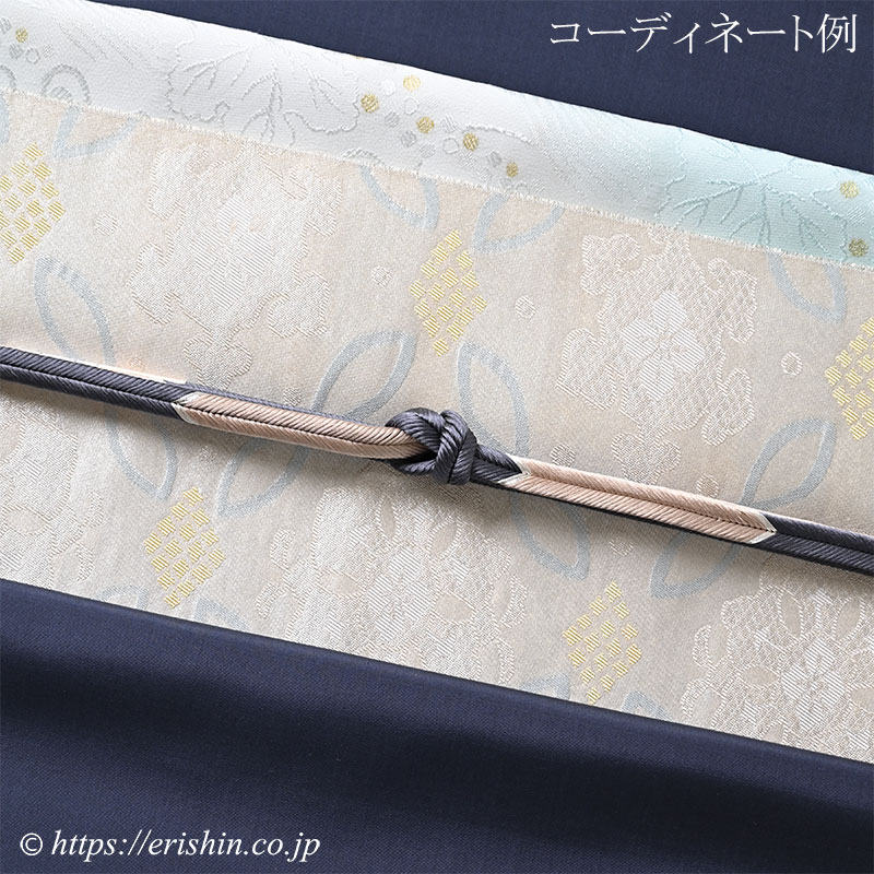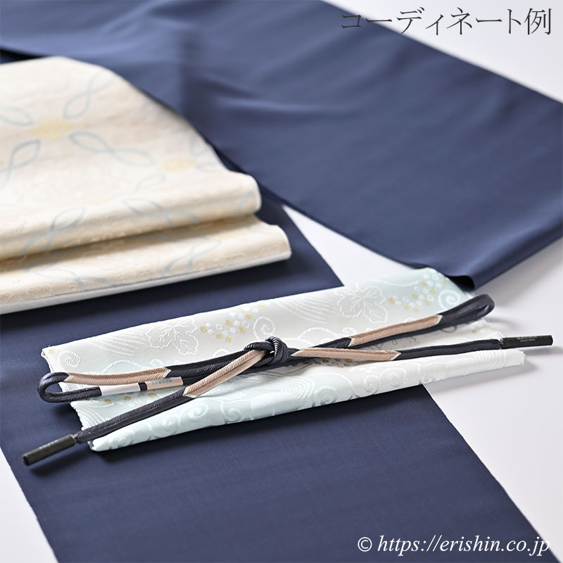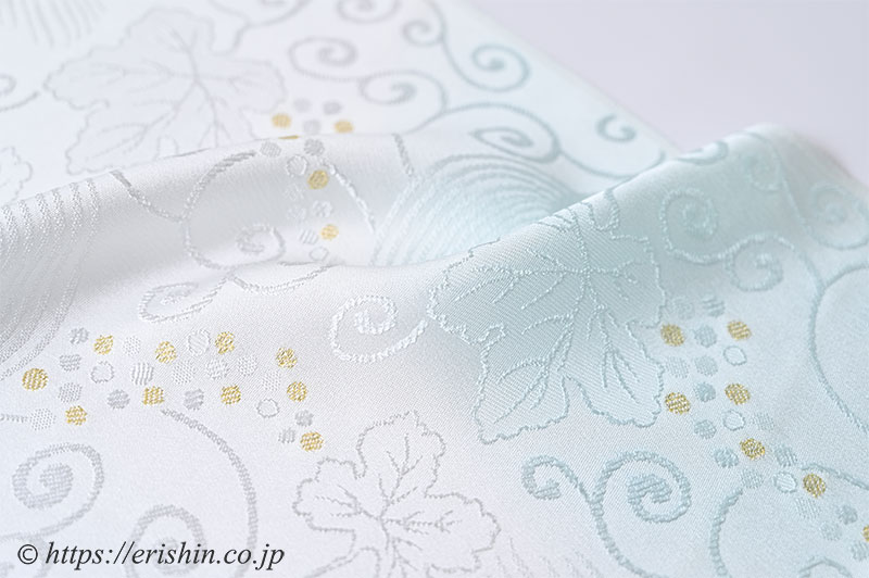 白色地に葡萄の実の金糸のきらめき、白郡色の暈しが冴えた帯揚げです。
