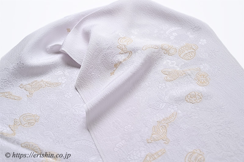 松や牡丹などの四季花文と宝尽くしが織り上げられた帯揚げ地をベースに、更に宝尽くし文様を金と白の縫い取りで立体的に現した帯揚げです。