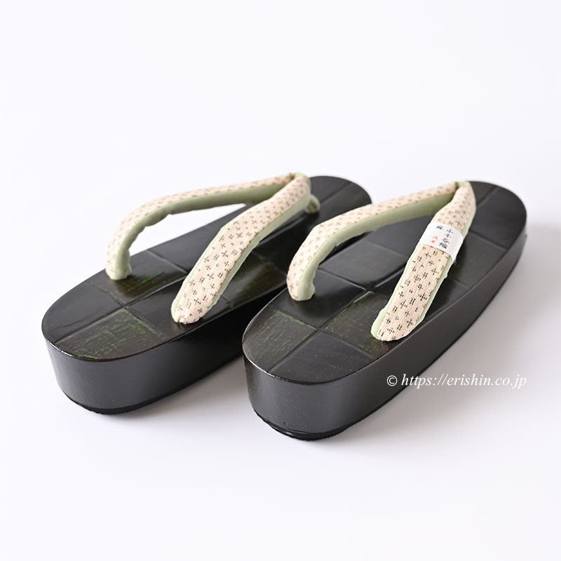 緑の研ぎ出しが顔を覗かせる黒緑色の鎌倉彫りの桐草履台に、クラシカルな蚊絣が愛らしい小千谷縮のハナオを挿げ、ご用意いたしました。