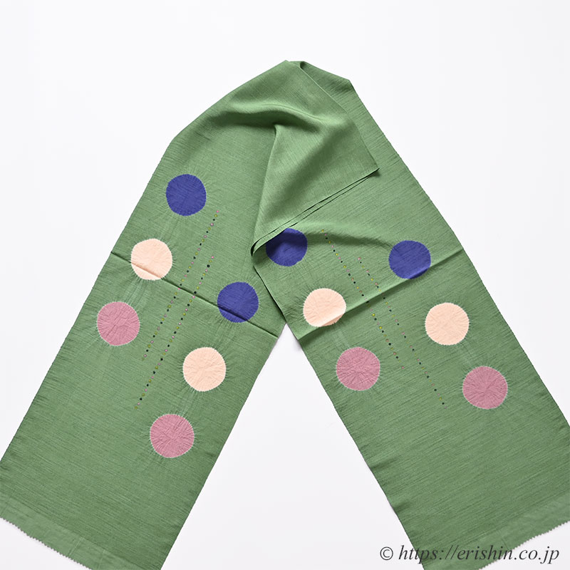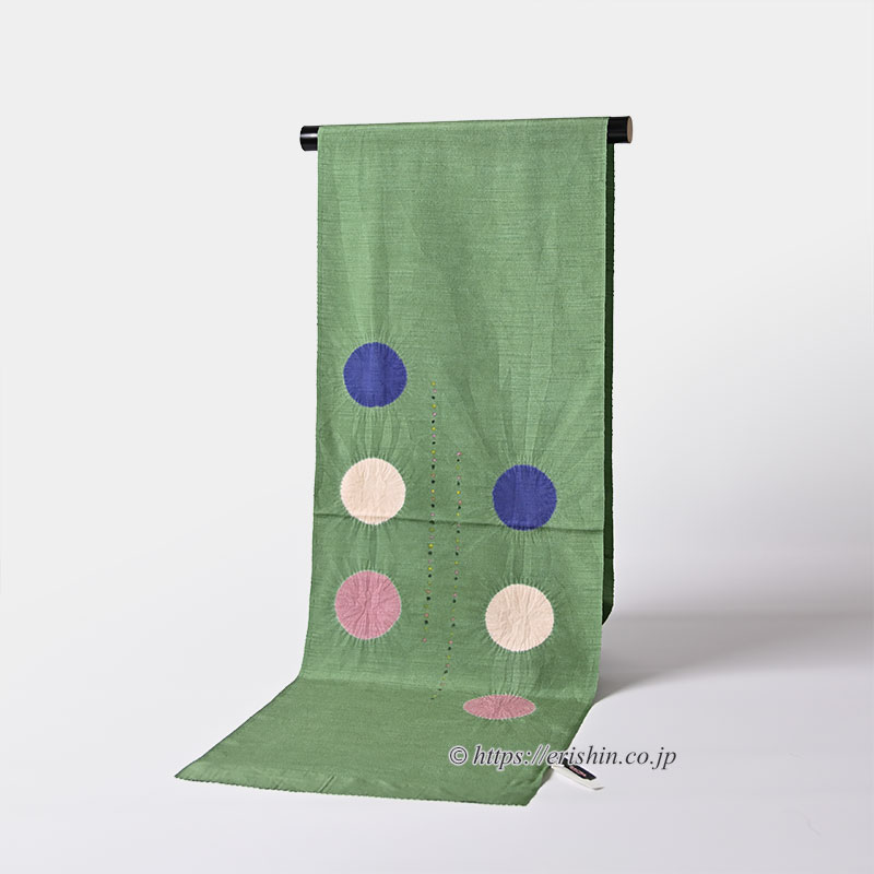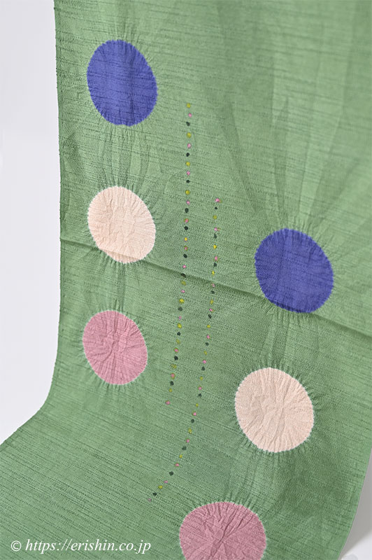 味わい深い若竹色の紬縮緬地に、ぽんぽんぽんと絞りならではのラインの揺らぎが楽しい大きな水玉が3つ。