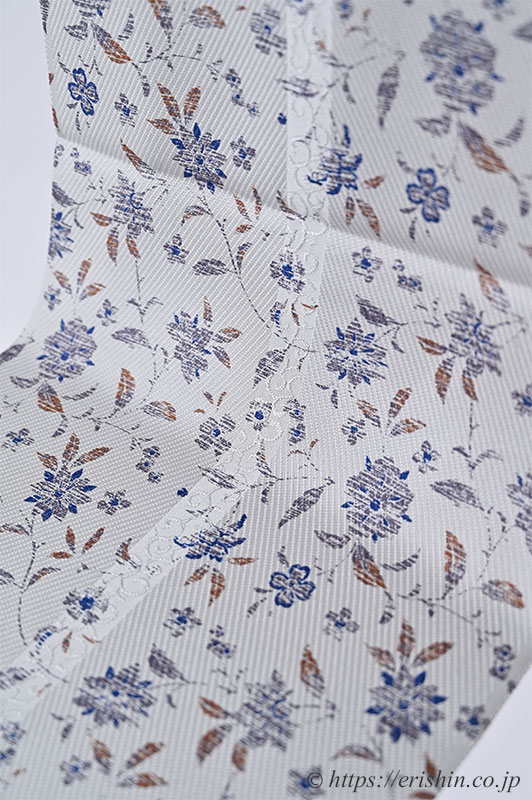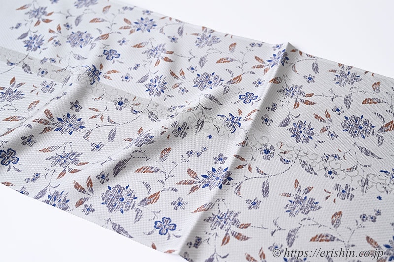 斜め縞と中心に更紗文をあしらった紋意匠帯揚げ生地は光沢があり、上品な明るいグレイ”錫色”を叶えてくれますね。