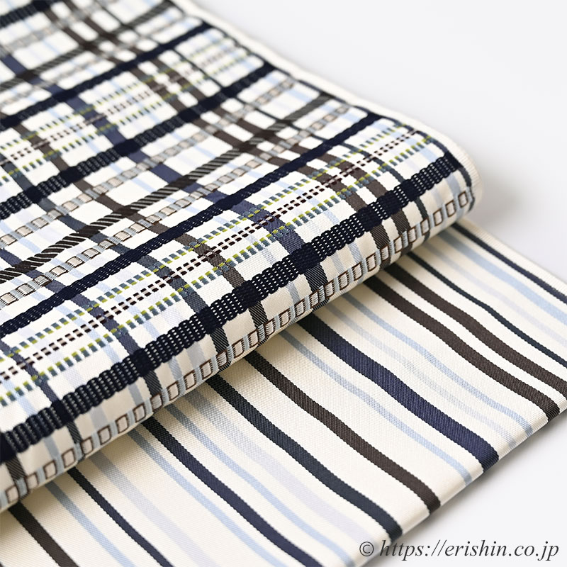 洛風林 九寸織名古屋帯(格子〔縞〕/白練地に焦げ茶色や勝色 等)