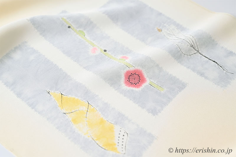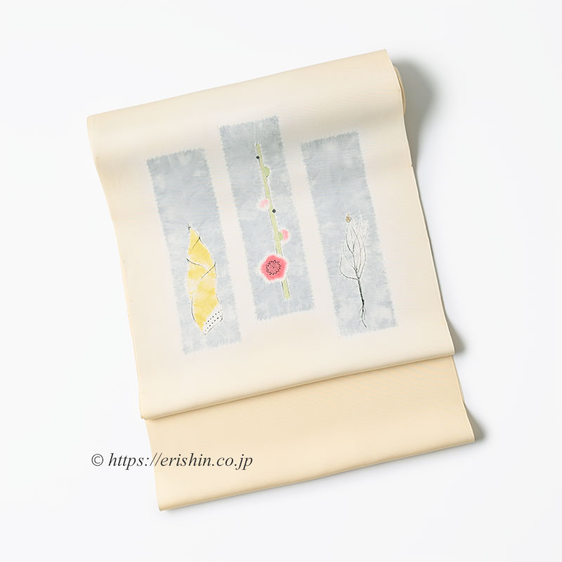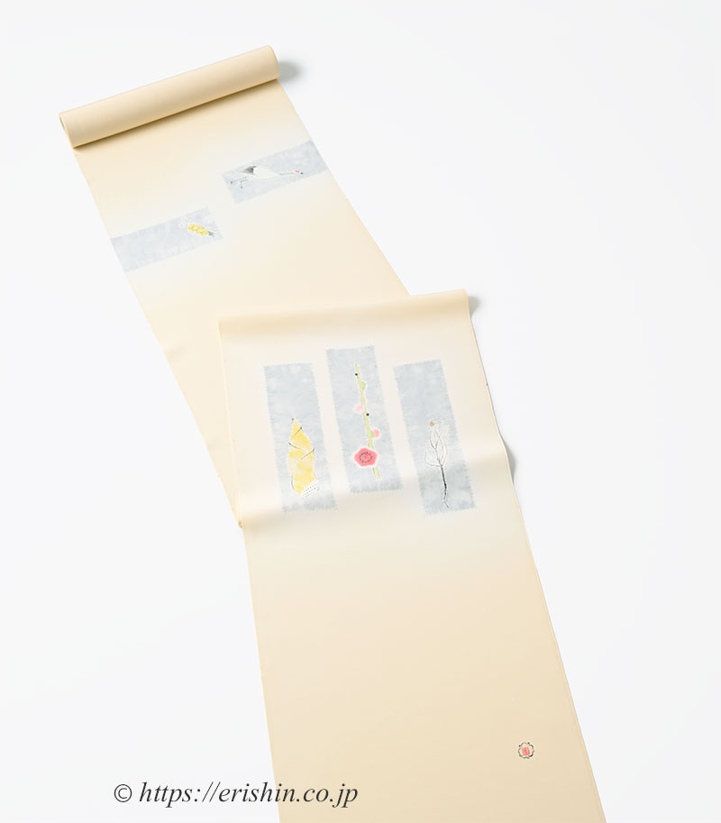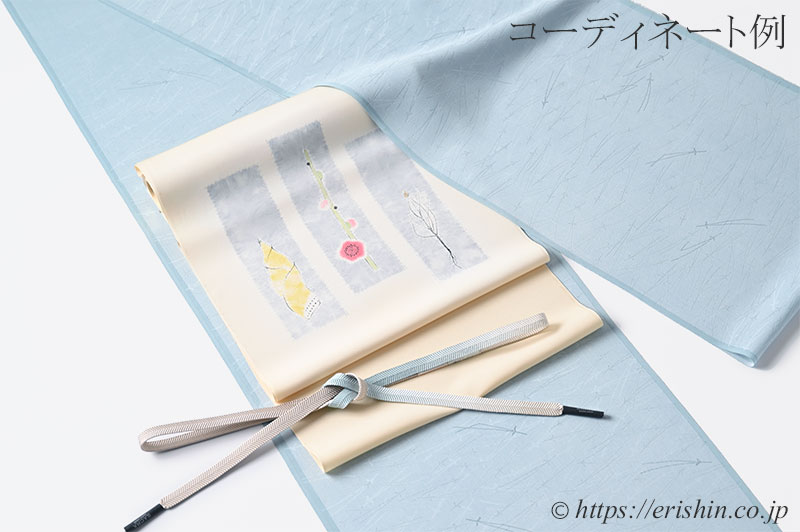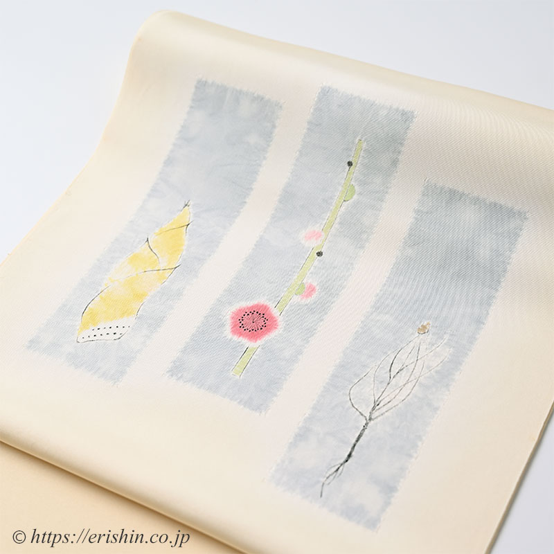 僅かに赤みを感じる淡い黄色”密陀僧(みつだそう)色”の塩瀬の帯地に、お太鼓には辻が花で染め分けられた空色鼠の短冊を。
