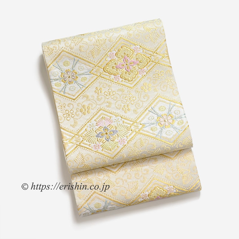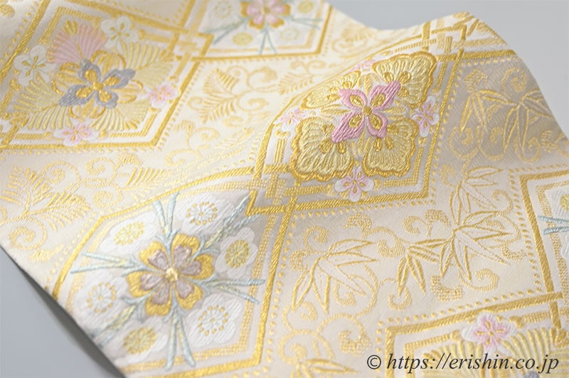 優しいパステルトーンで織り上げられた松竹梅はふっくらとした織り味で華やかですね。