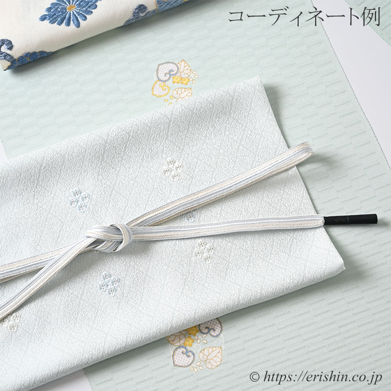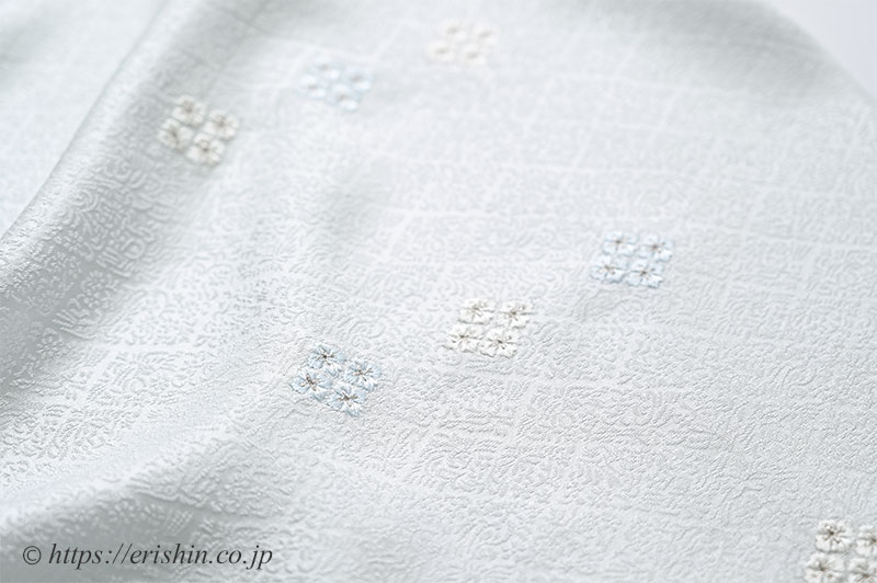 その中心に小花菱の刺繍を白藍色と白の二色であしらった帯揚げです。